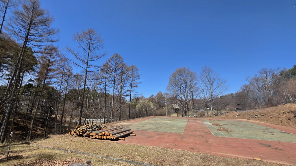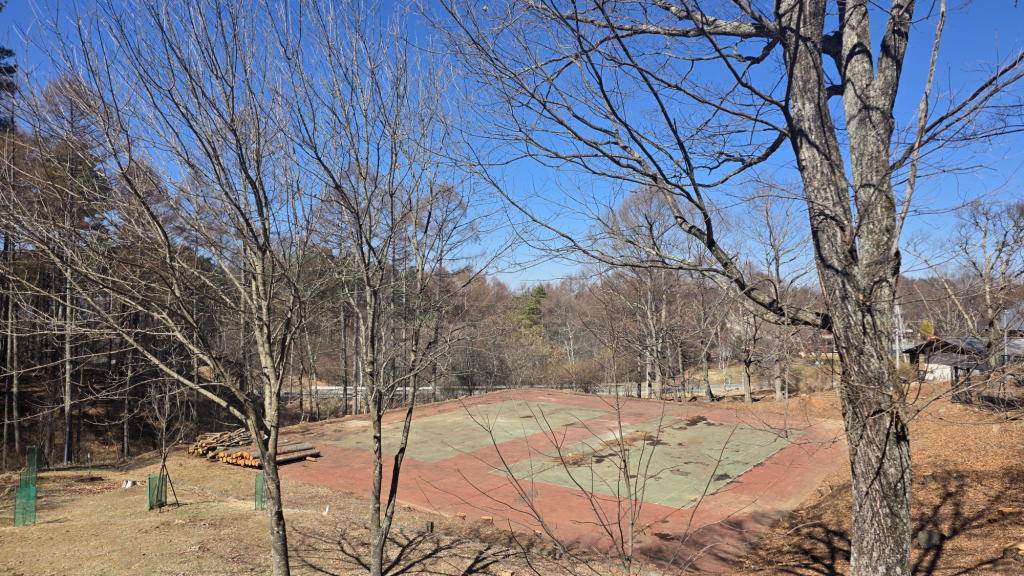 土や落ち葉に覆われていたテニスコートサイドのスペースは、それらが撤去されて、元のテニスコートに近い状態に戻っている。