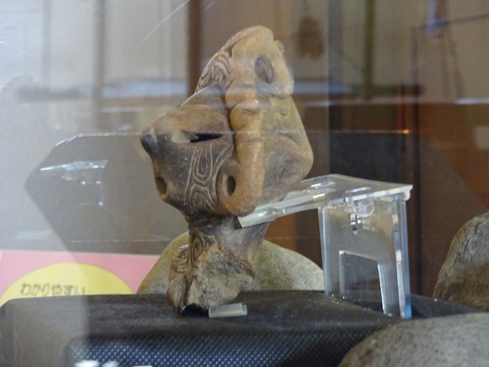 顔がピカピカに磨かれ、細い線で模様が描かれているとの解説も付されていた。細い線の溝には「赤い塗料」が塗られていたそうで、正に「美肌&美メークアップ」が施されていた事になる。単独展示であるが故に、この土偶さんは様々な角度から観賞できた。正面だけでなく、実は横顔もとっても美しい土偶さんだ。「ミス 石之坪遺跡」という肩書きは的を射ている。