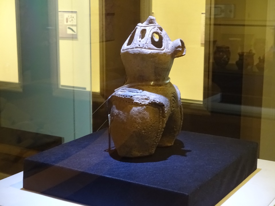 お目当ての「中空土偶さん」は、ここでもVIP待遇。室内の右手奥に立派な展示ケースを与えられ「完全個室」状態である。あまりにも目立つ扱いなので、この主役から鑑賞する。正面からみた姿は極めてユニーク。これはどう見ても「宇宙服」だろうと、思わず呟いてしまった。中空な上に、まるでティーポットの注ぎ口のように「口」らしき部分が突き出ている。この口の位置が、目らしき穴よりも下にあるので、実際に液体を入れてティーポットのような使い方が出来たのではないかと思う。縄文人が果実酒か何かを注いだ容器ではないかと勝手に想像する。この「想像」というプロセスが、縄文土偶探訪の醍醐味だ。
