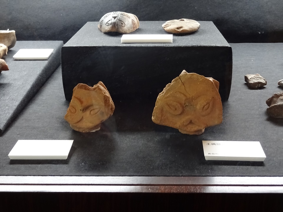 ああそうだ、正午までにオフィスに戻る予定だった。ふと、我に返り、縄文時代の展示スペースに並んでいる他の土偶さん達の鑑賞に移る。あれっ、どこかで会ったぞ? そんな感じの「ソックリさん土偶」が並んでいて、とても楽しめた。例えば下記写真の右側にある「土偶頭部」。そのお顔は、南アル伝承館の「円錐形土偶さん https://www.triglav.life/?p=12678」によく似ているではないか。