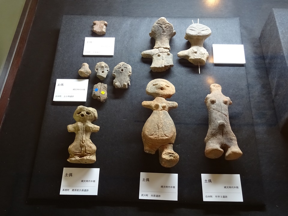 それから下記写真前列中央の土偶の顔を見て欲しい。こちらは、山梨県立考古博物館の「いっちゃん https://www.triglav.life/?p=12613 」や韮崎市民俗資料館の「ミス 石之坪遺跡 https://www.triglav.life/?p=12645 」系のお顔である。全国各地の考古博物館を探訪し、数多くの土偶さんに対面してきた結果、自然と土偶さん達を「分類・類型化」しようとしている自分に気が付く。これがまた楽しくて仕方ないのだ。