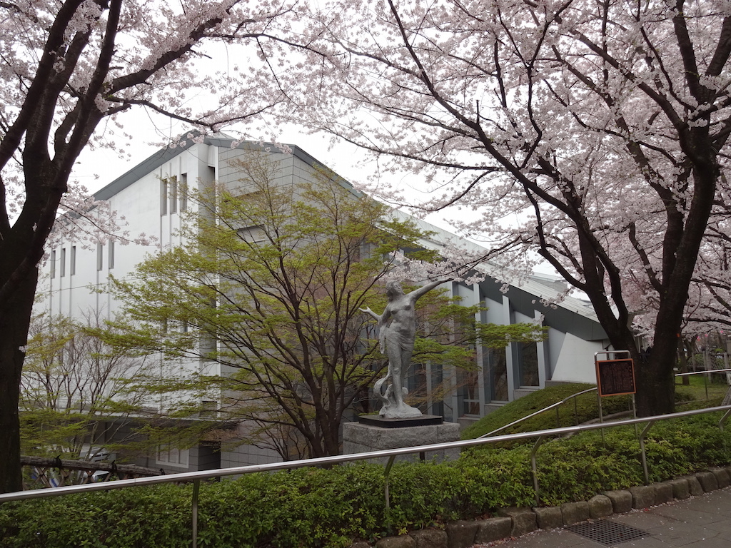 北区飛鳥山博物館の外観。博物館がある「飛鳥山公園」が桜の名所である事は初めて現地で知った。天気は残念ながら曇り空であったが、桜は満開に近く、園内は花見客で賑わっていた。