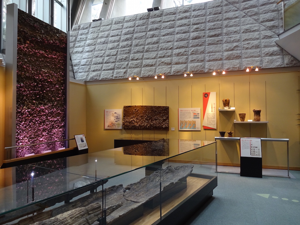 1F常設展示場の受付奥には「縄文コーナー」が設けられていた。奥の壁にそそり立つ「貝塚の地層」とその手前に鎮座する「丸木舟?」は存在感抜群だった。