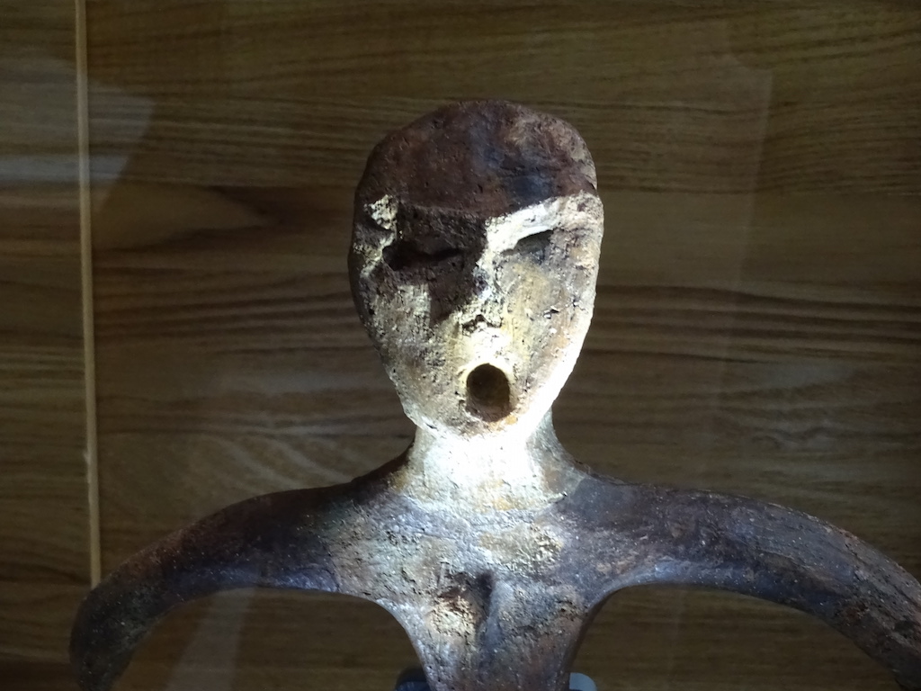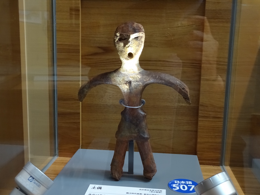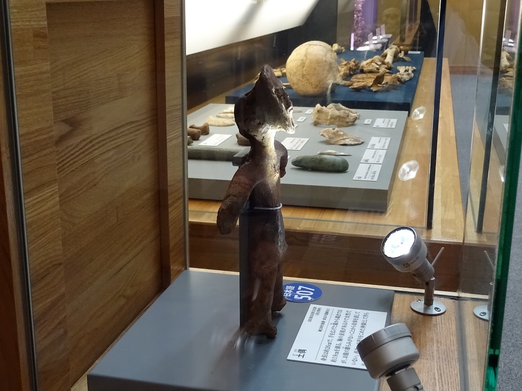 1F入り口から見て「丸木舟」展示ケース奥、左側の壁際に土偶が1体単独展示されていた。周囲を見渡しても土偶さんはこれ1体のみ。これまで見てきた「大型土偶」の中では「スリムさ」が際立つ。