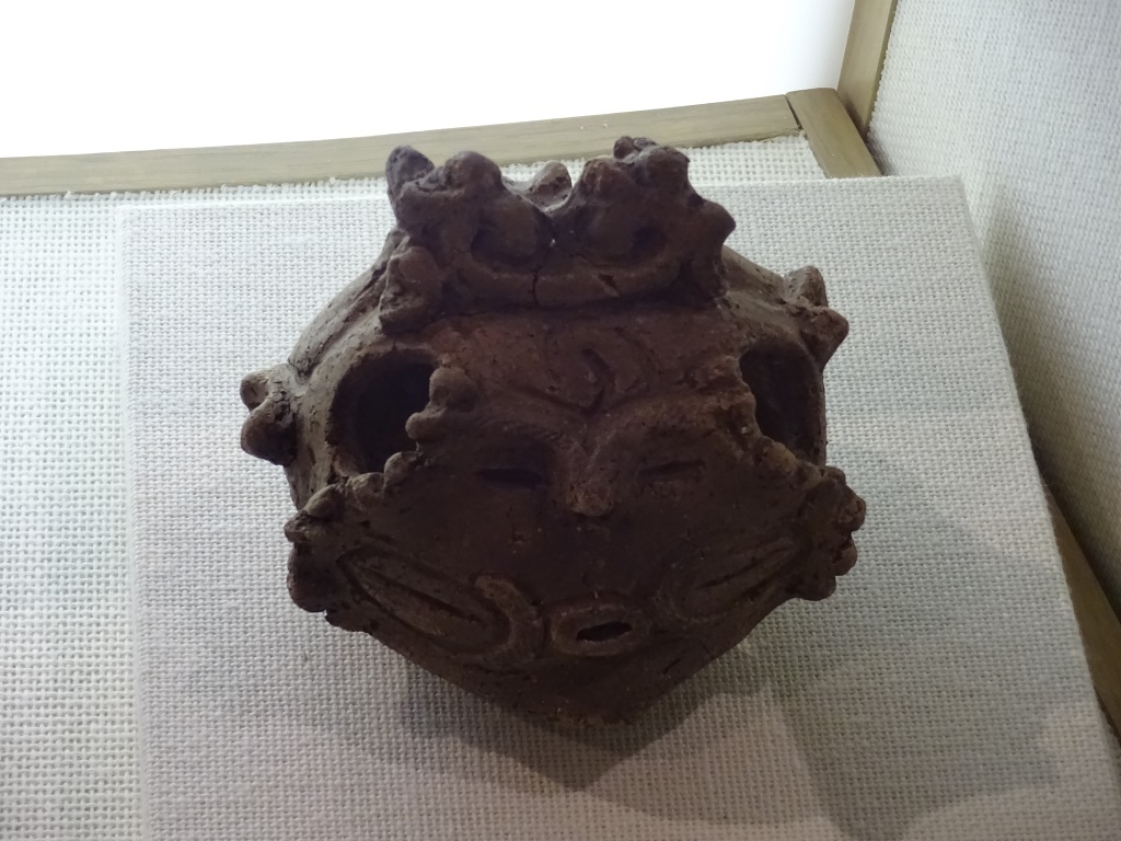 よく見ると、一番奥の列は「遮光器土偶」の頭部や腕等である。遮光器土偶と言うと、青森県木造亀ヶ岡遺跡出土の「しゃこちゃん(国指定重要文化財)」に代表されるような「ゴーグルのような目」が真っ先に頭に浮かぶ。だが、この遮光器土偶さんの目は、小さくて細い。さらに、頭の両脇には、ぽっかりと穴が開いている。う~ん、あの穴は何なんだろう? 遮光器土偶としては、結構、レアモノ系かな? 興味は尽きない。