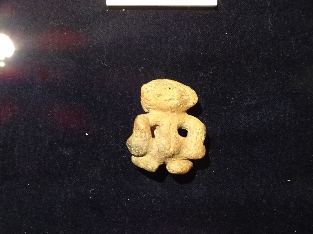最近の探訪で目にする事が増えてきた「小型土偶」さんも何体か展示されていた。下の写真は、花上寺遺跡出土の小型土偶さんで、岡谷市指定有形文化財である。Webには「高さ4cmの超小型土偶で、小竪穴から完形で出土した。目、口、鼻、手指など細部もしっかり表現されている。」とある。