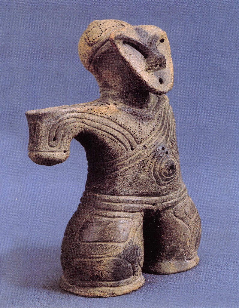 自分で撮影した写真がないので、どうも文章を書く際に、土偶さんのイメージが頭に鮮明に浮かび上がってこない。解説については美術館Web掲載のものをそのまま抜粋しよう。仮面土偶(縄文時代後期)】昭和初期、辰野町新町泉水地籍で行われた開田工事の際に発見された。高さ20cmで、両腕を左右に広げ、力 強く足をふんばり、当時の出産の姿勢を示すと言われている。顔面にはこの土偶の名のとおり、逆三角形の仮面を付けた表現がある。昭和54年、長野県宝の指 定を受けた。 → との事である。