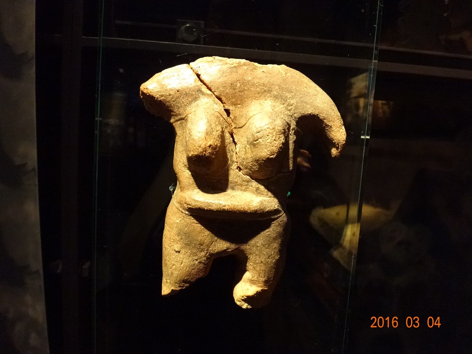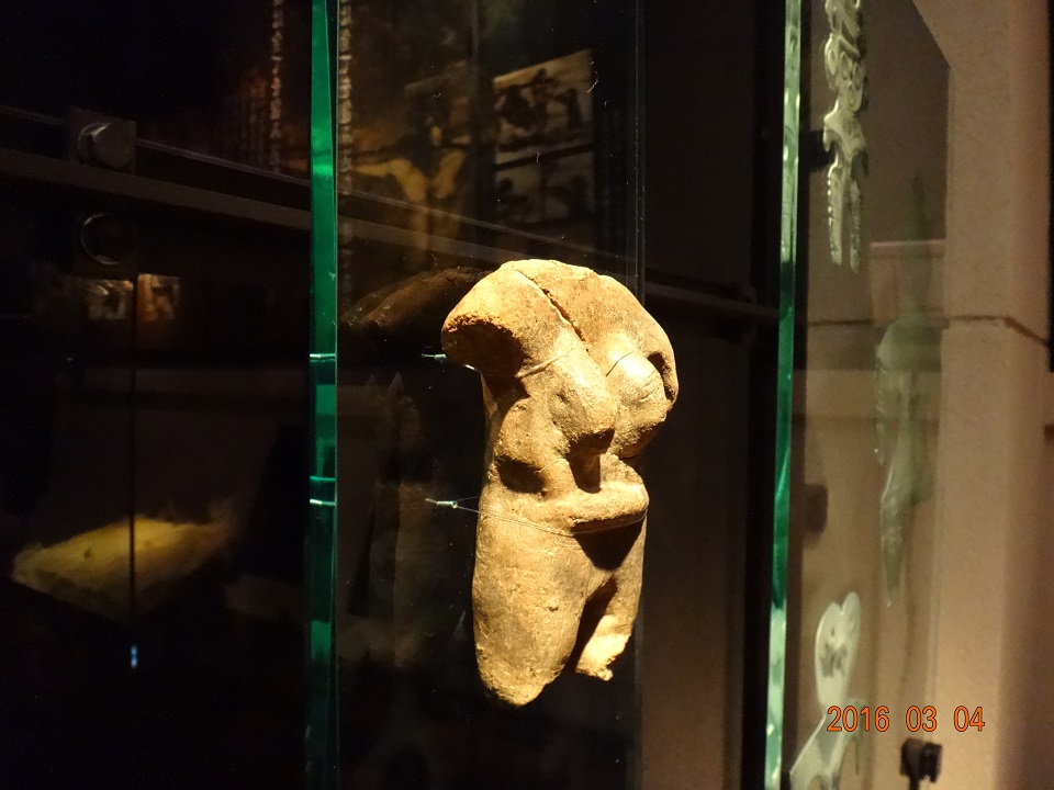 土偶さんは、どこ? 探すまでもなく、すぐに発見。メインスペース奥の壁に、数は多くはないが、土偶さんらしき姿が確認できた。縄文式土器等、他の展示物をサラッと見学した後、お目当ての土偶さんコーナーに向かった。