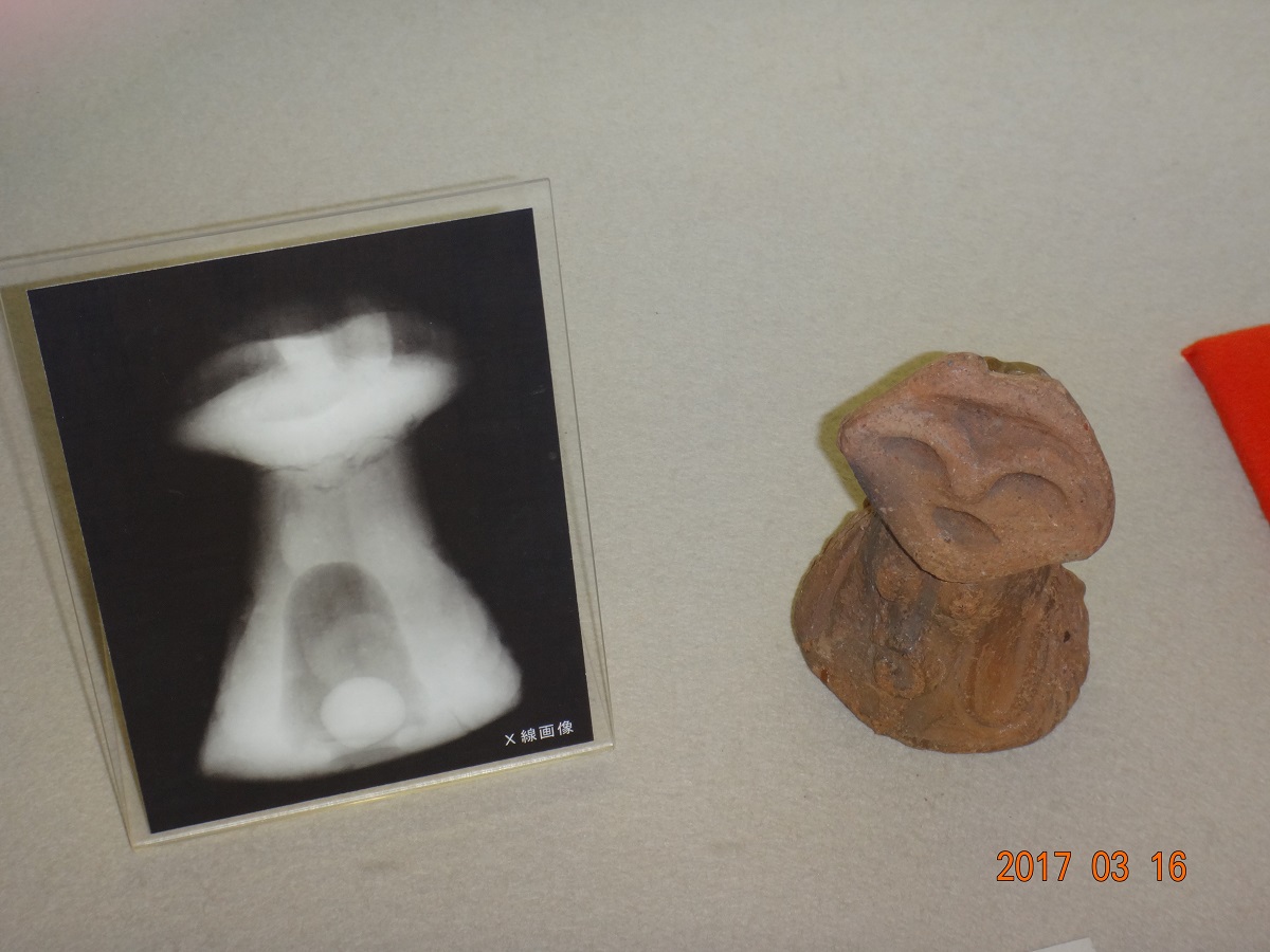 と、よく見るとちゃんとX線写真が添えられていた。たしかに空洞となっている土偶さんの下部(ボディ)部分に、ちょっと潰れたボールのような物が入っている。土偶さんの上部(頭部分)を手に持って振ったら「鈴」になるよなと納得。