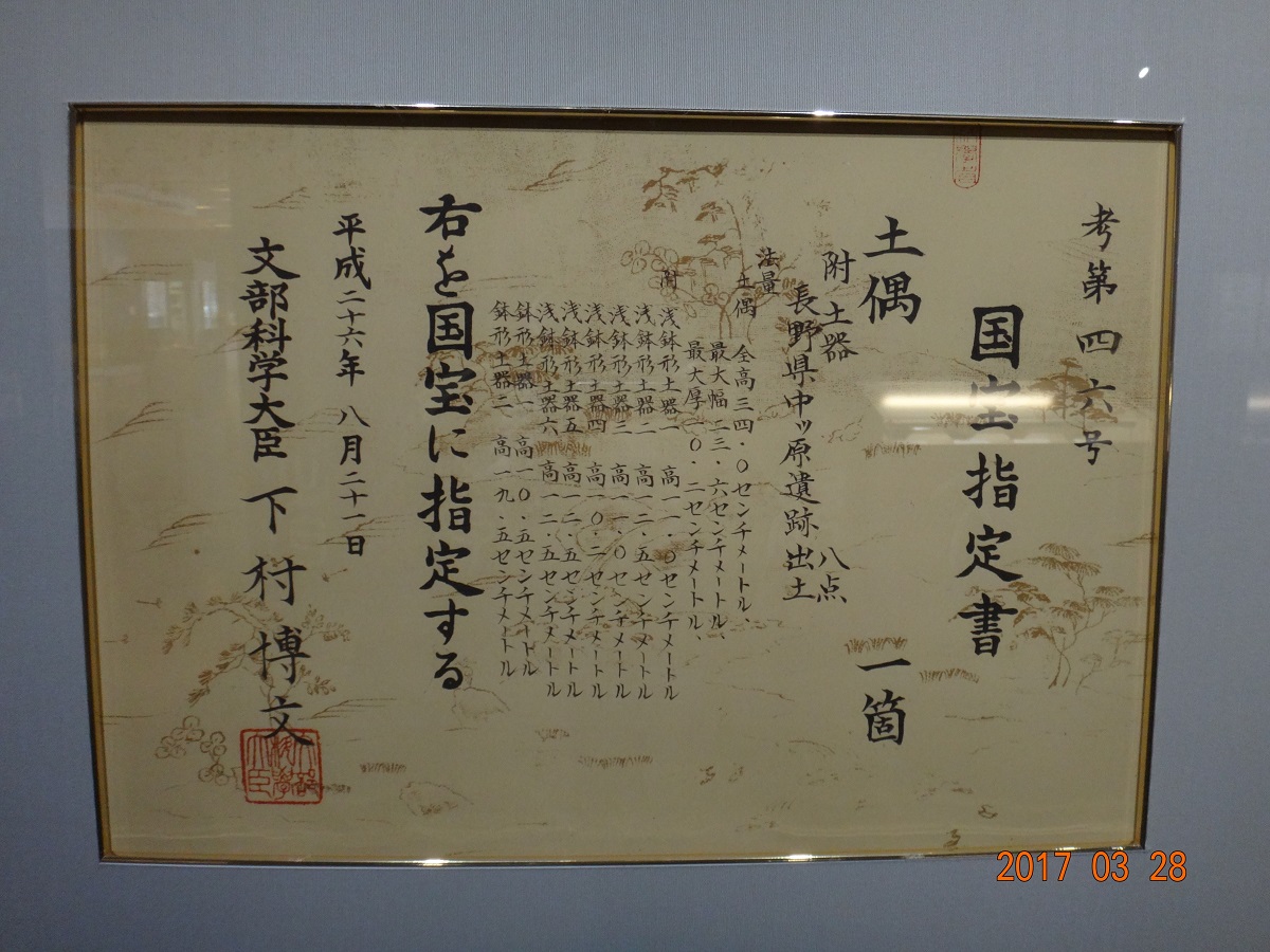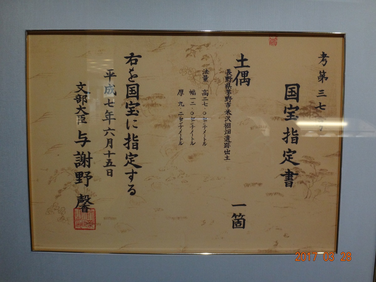 仮面の女神の国宝指定書。「仮面の女神の国宝指定へ」と報じられた翌日の尖石縄文考古館の一般客来館第1号は私だった(と信じている)。詳しくは、【縄文土偶探訪記】Season 1の尖石編をご覧いただきたい。