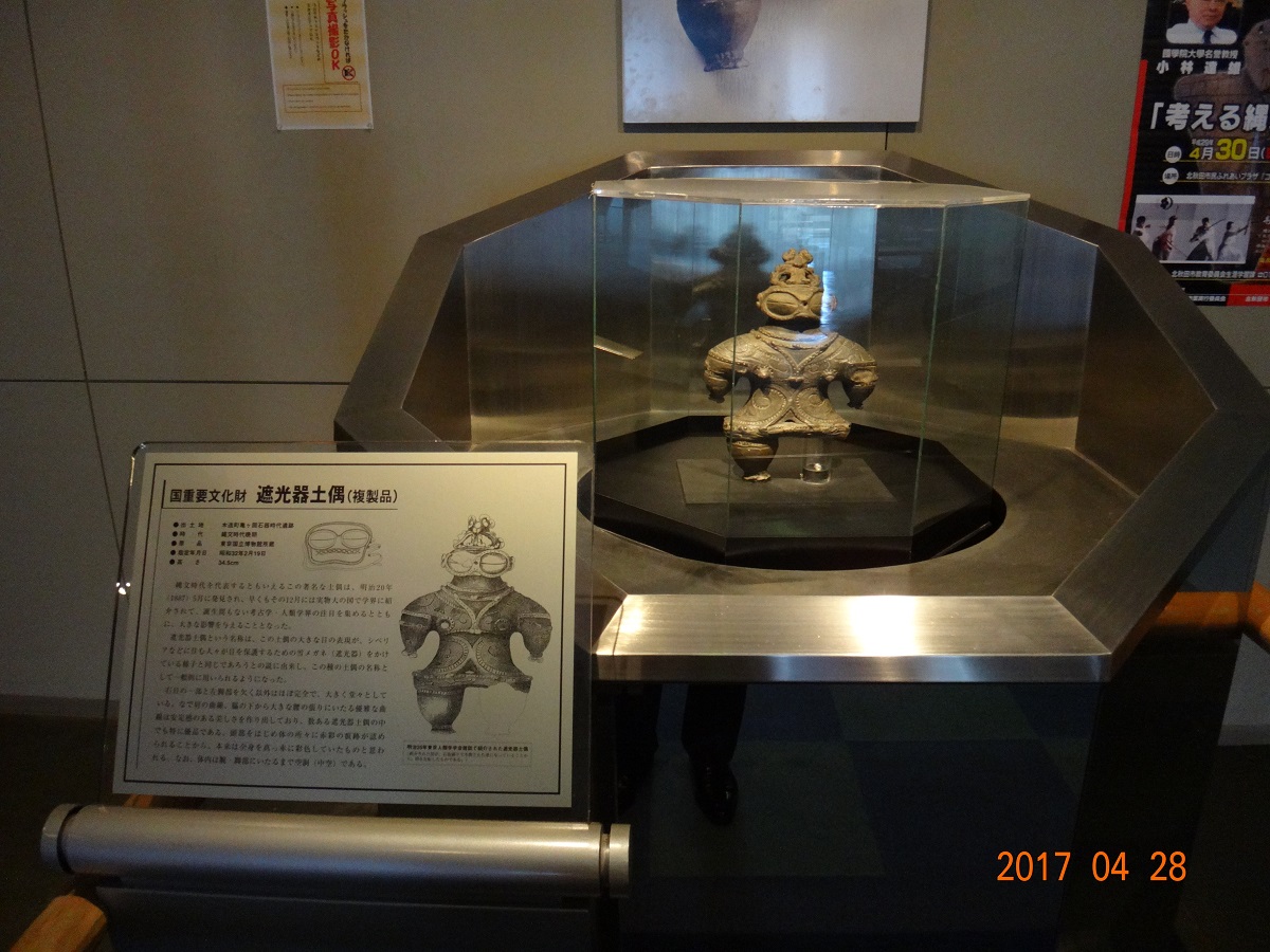 正に「しゃこちゃん三昧・しゃこちゃん尽くし」状況に大満足しつつ、2Fの展示スペースに移動。展示物は土器が多いが、中央の展示ケースには、しゃこちゃんのお友達である「遮光器土偶」を主に、土偶さんが数体展示されていた。