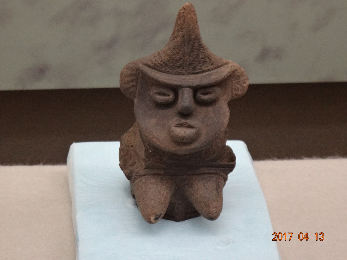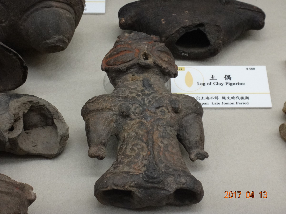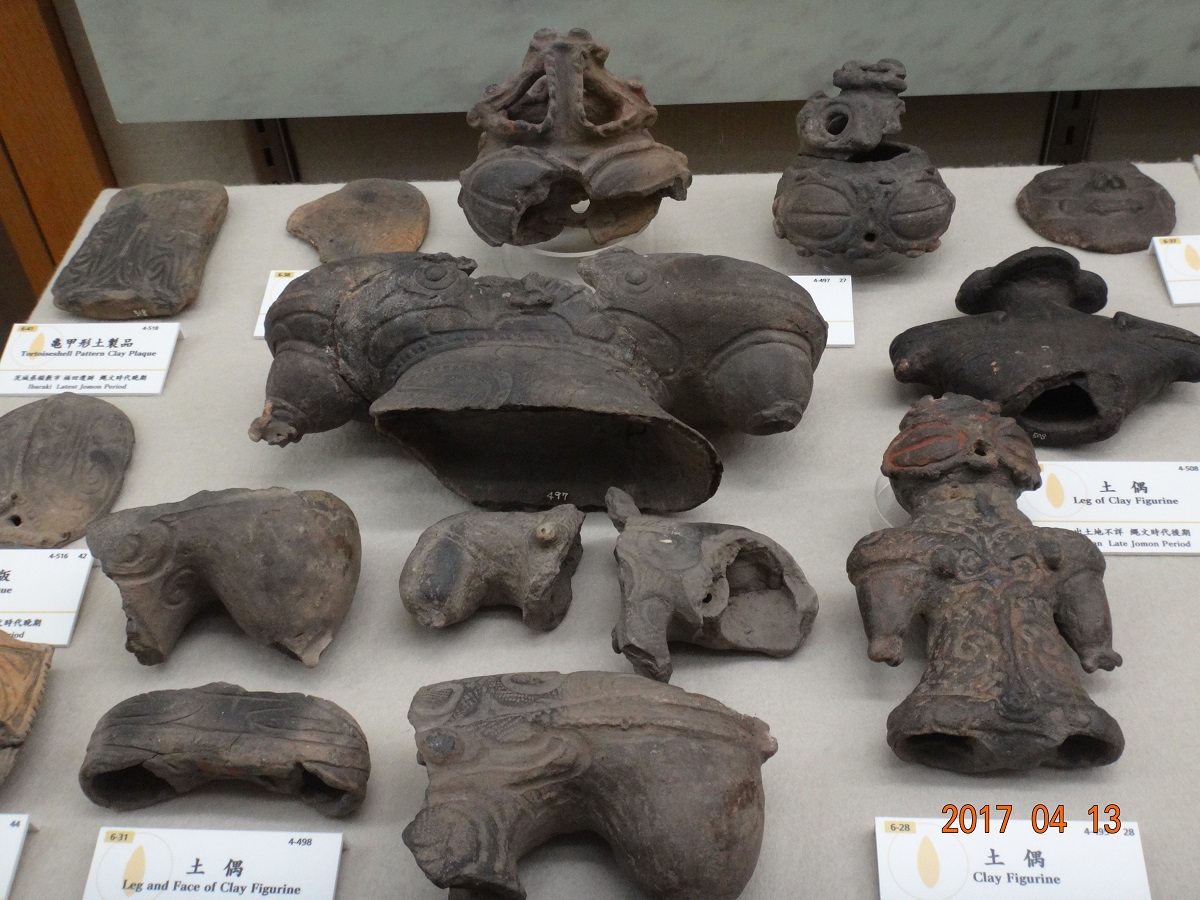 その左下には「遮光器土偶」さんが数体展示されている。左下に位置するやや小型のほぼ完成形(脚部がかけているのかな?)の土偶さんは、岩手県出土。目と胴体部に赤いお化粧らしきものが残っている。