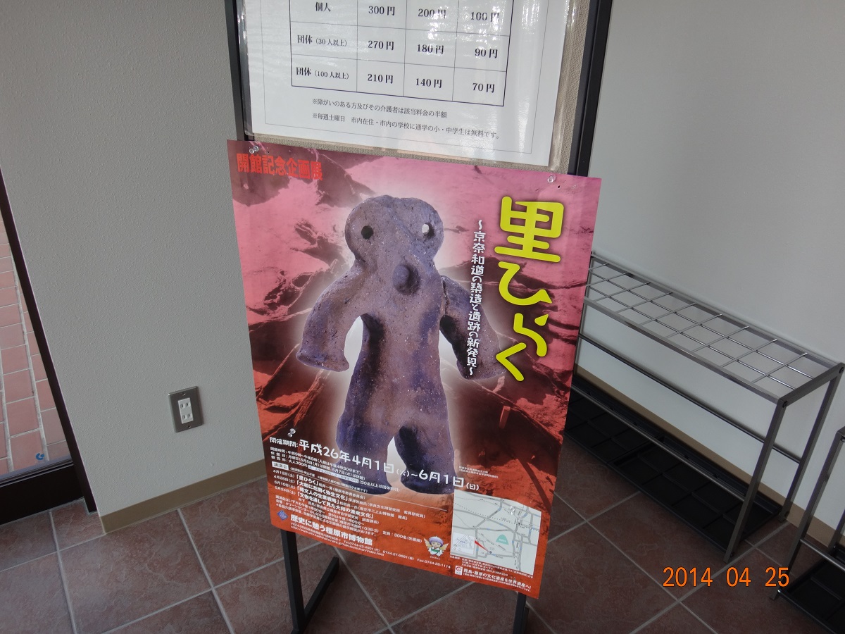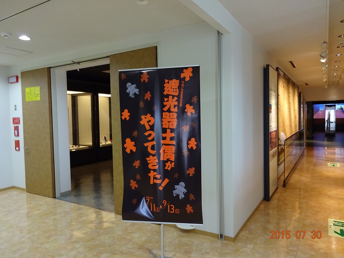 2回目の探訪時(2015年7月30日)の案内ポスター。「遮光器土偶がやってきた!」展を開催中だった。かほちゃんは、常設展示室ではなく、企画展示室に出稼ぎ中であり、対面は出来たが、写真撮影は不可だったのだ…