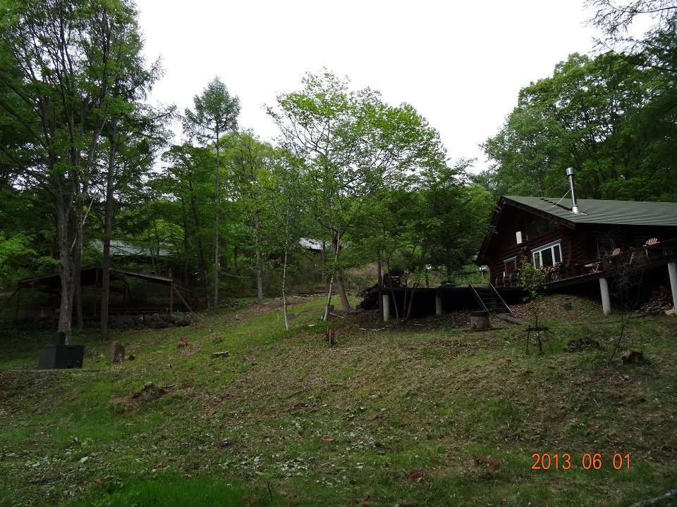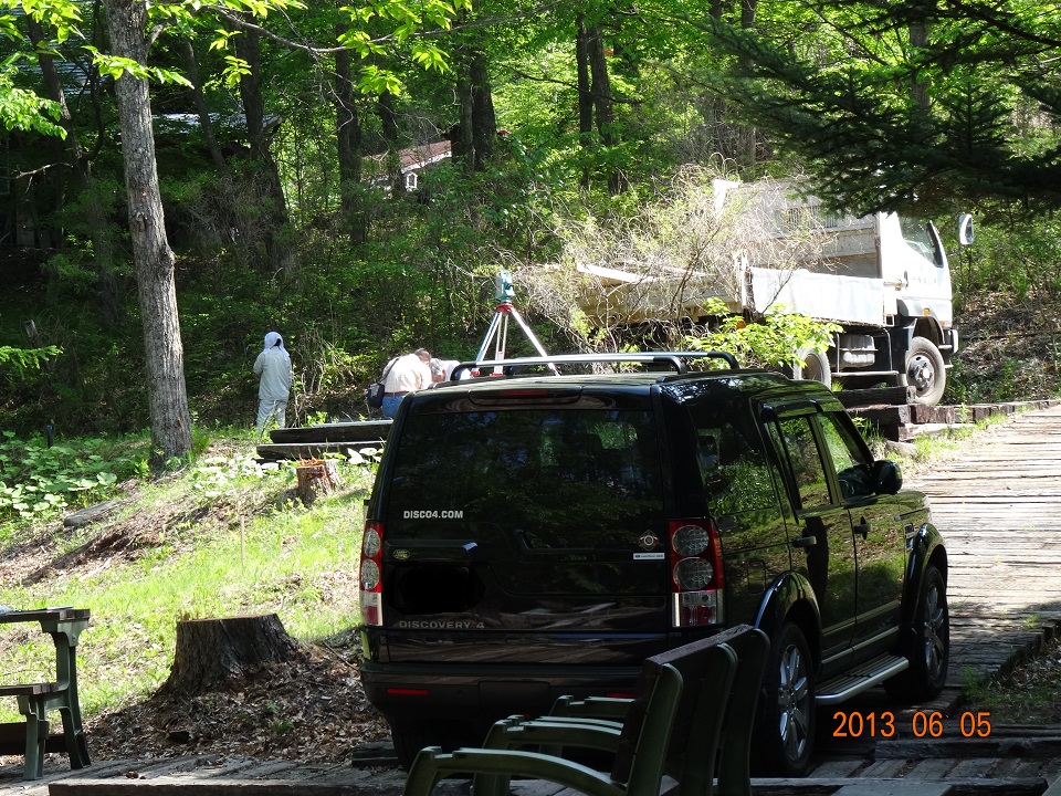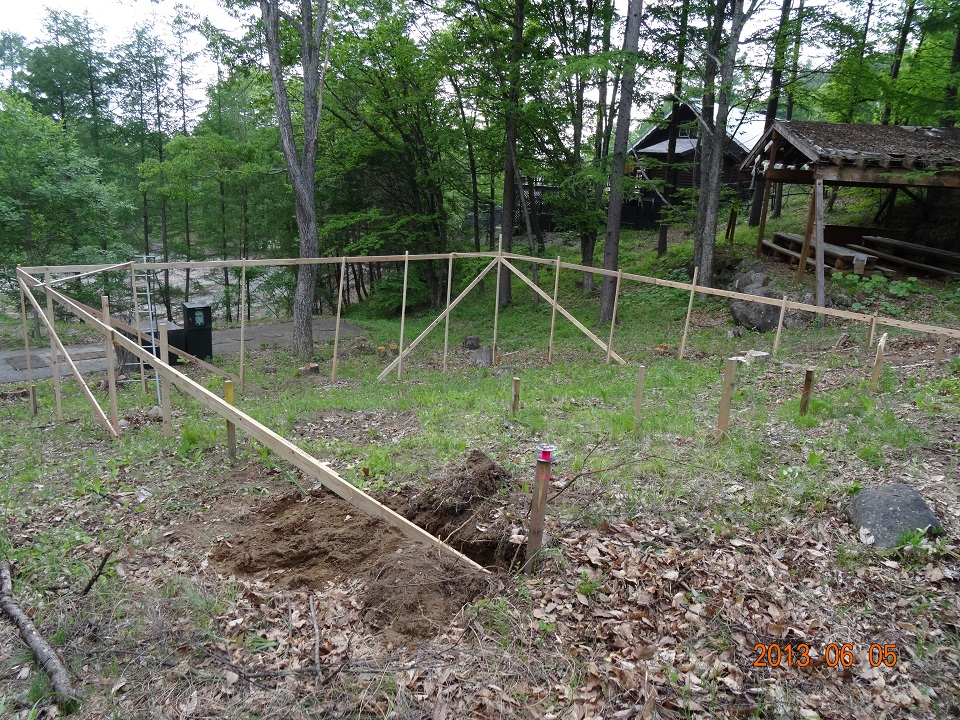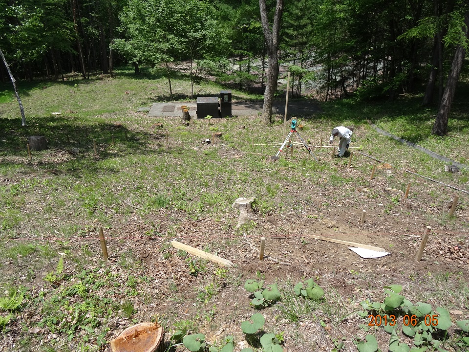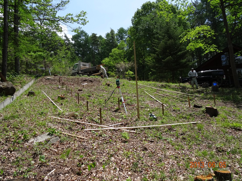 2013年6月5日《基礎工事編》初日 2013年6月5日。オフィス・セルフビルド基礎工事の初日である。基礎工事・水道工事・電気工事については専門業者さんに施行を依頼。初日の基礎工事は、所謂、「地縄張り」「遣り方」の作業が進められた。 基礎工事着工前のオフィス建設予定地を撮影した写真。本宅ログハウス左手奥に広がる傾斜地が予定地だ。事前に実施した地盤調査で、建設に問題が無い事を確認済みである。 基礎工事をお願いした建設業者さんには、2016年にオフィス・ウッドデッキの基礎工事を再度お願いする事になる(= とても信頼できる業者さんだからである)。初日は2名。手際よく作業を進めて行くのに驚く。やはりプロである。 「地縄張り(これから建てようとする建物のおおよその位置を確認するために縄を張ること)」のための測量が始まった。ログハウス・キットを注文した会社の社長さんが立ち会って、確認作業を行う。 オフィス建設予定地を枕木駐車スペースから見下ろした光景。地縄張りのための杭がどんどん打ち込まれて行く。 こちらは建設予定地を下から見上げた光景。改めてかなりの傾斜地である事を実感。遣り方(建物を建てる前に,柱・壁などの位置,高さの基準となる水平線などを標示するため敷地に設ける仮設物)のための背の高い杭が1本打ち込まれている。 初日作業が終了した光景。背の高い杭と杭の間に横に通した板が基礎のレベルを表すのだと思う(聞くのを忘れてしまったが…)