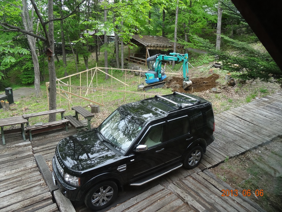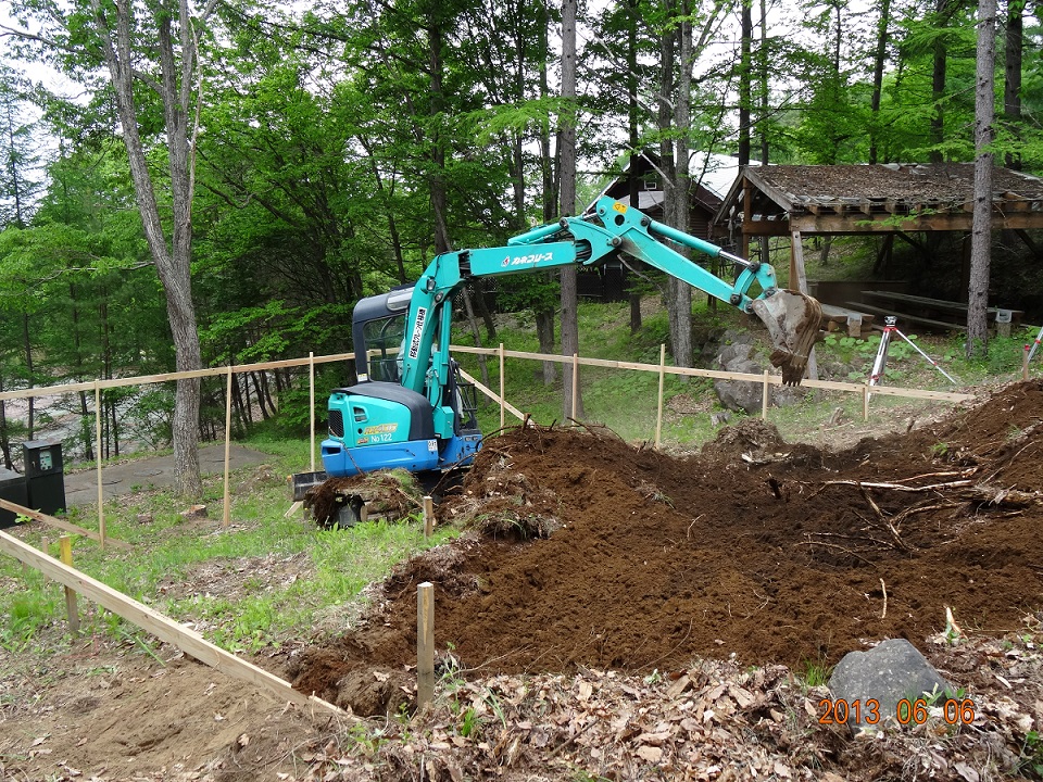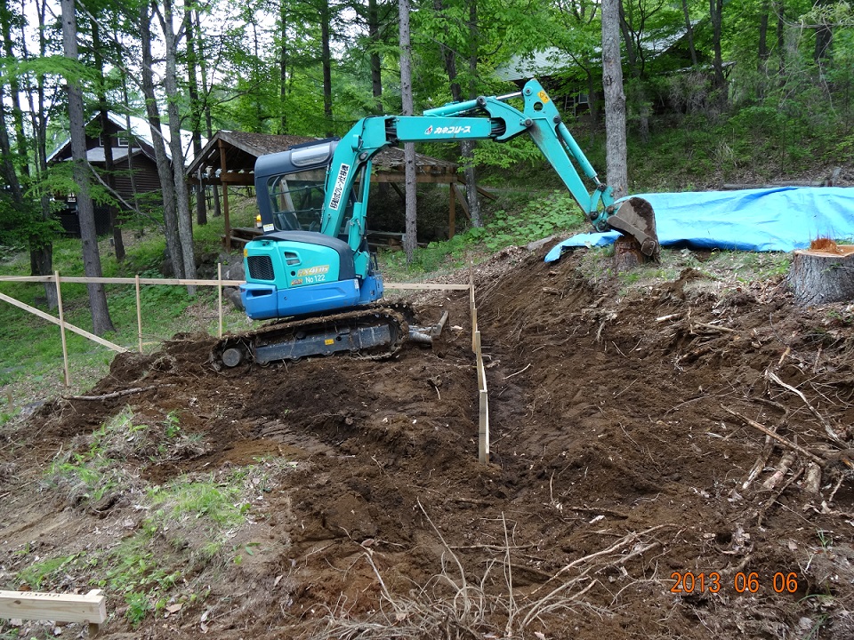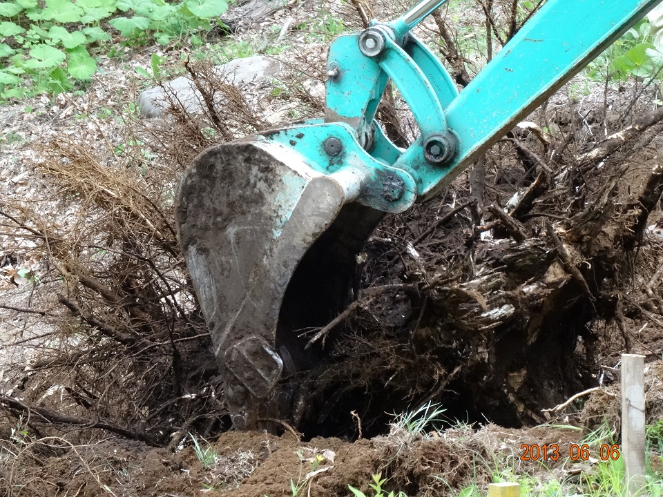 基礎工事は2日目を迎えた。朝からいきなり「ユンボ」が搬入され、オフィス建設予定地とその周辺の整地作業が行われた。整地作業のメインは、基礎工事作業前に伐採した広葉樹や松の根の掘り起こしと処分である。幹の太さから想像していたよりも、根の部分ははるかに大きくて(そして重そうで)驚いた。以前レンタルした事のある小型のユンボ「ナナちゃん」では、とても対応できなかっただろう。