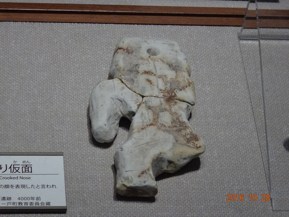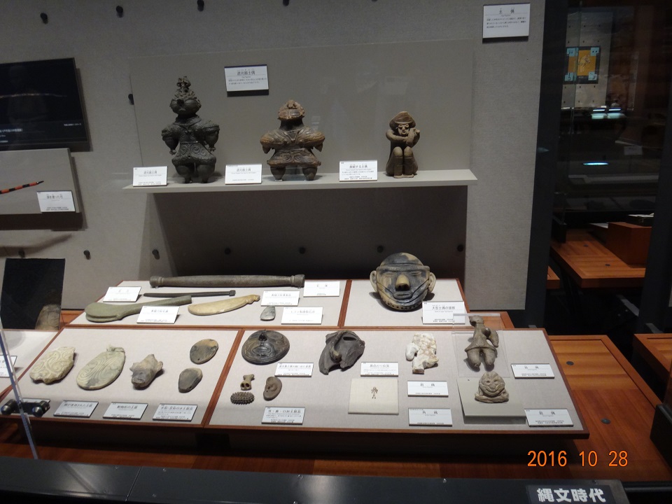 躊躇なく「縄文時代」の展示コーナーに直行。オオ、宮城と岩手の有名土偶さん、土面さんが勢揃いだ~ でもレプリカが多いぞ…