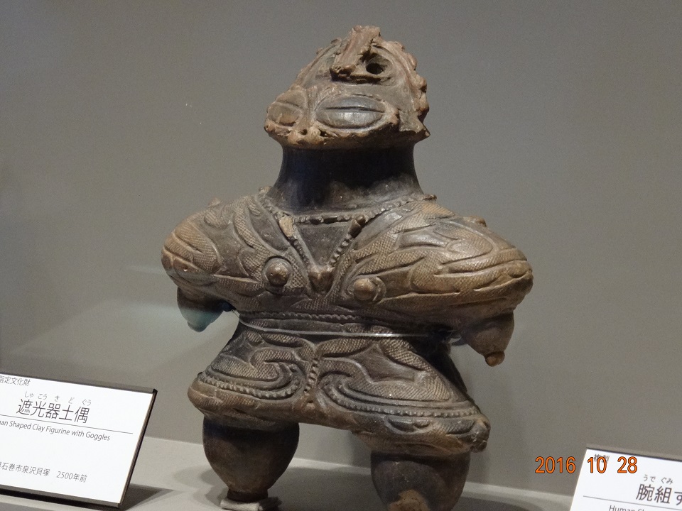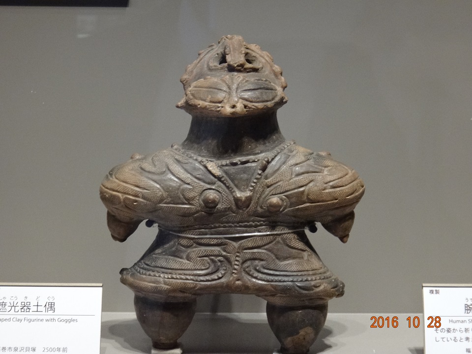 今回探訪のメインターゲットである遮光器土偶さん。石巻市泉沢貝塚出土(約2,500年前のモノ)。「正五角形」をイメージして作ったのではないかと思わせるガッチリ体型と癒やし系のお顔のコラボが素晴らしい!