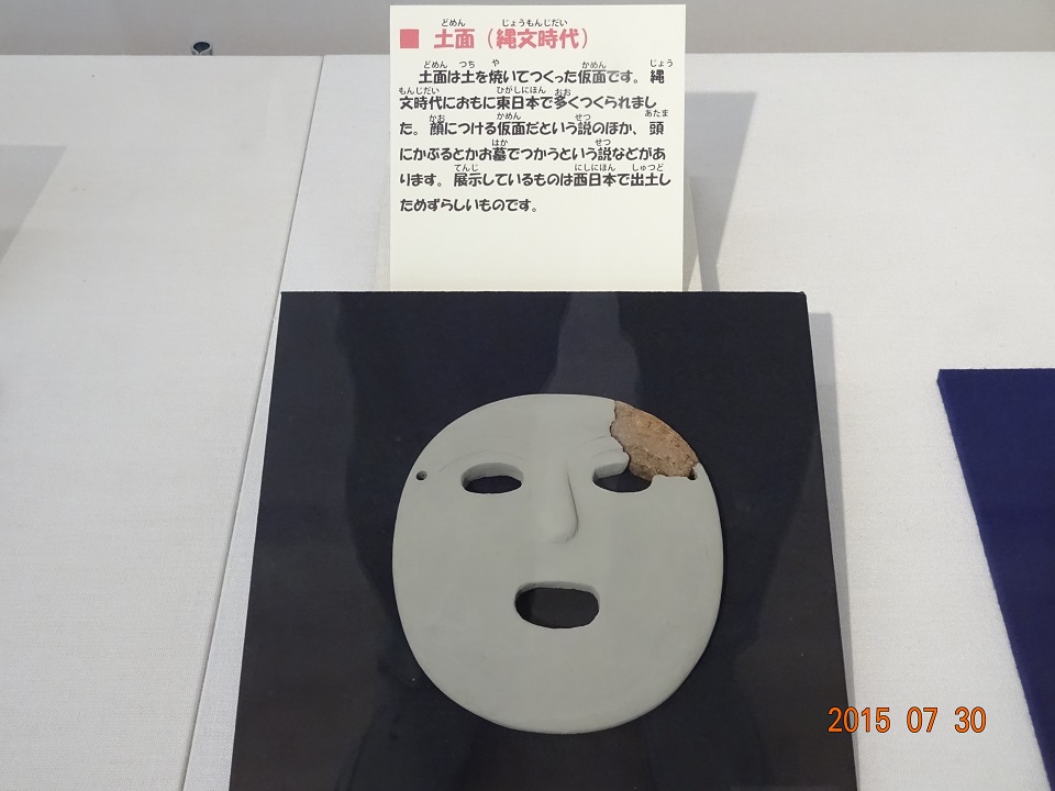 さらに、その左には「土面さん」が..「これはレア物だ!白い土面なんて初めてだぞ。」と思わず感動しかけた。が、よく見たら白い所は予想復元した部分のようだ。もしかして、実物は左目の上の部分だけかな? だとしたら凄い復元(想像)力である。