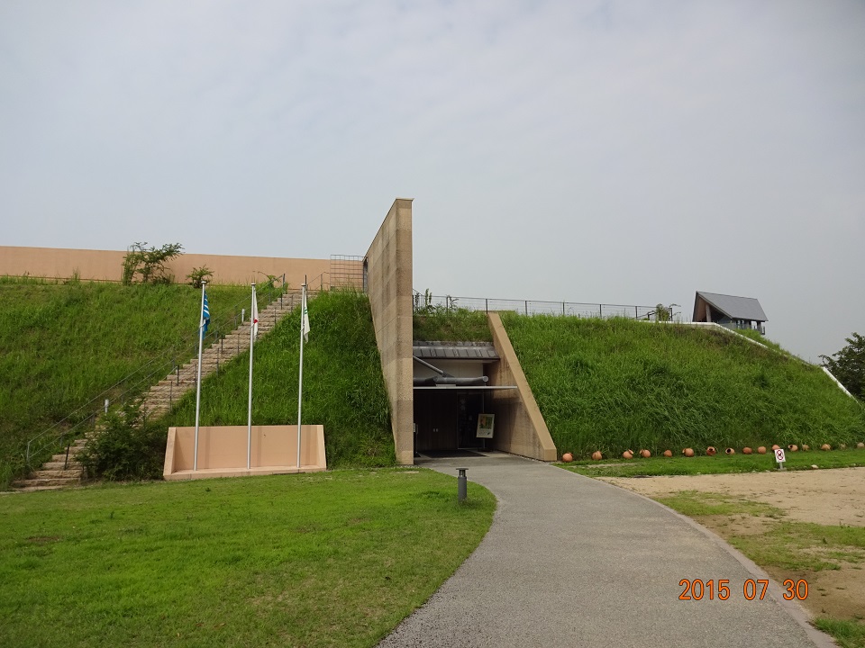 兵庫県立考古博物館の外観。この緑は芝?それとも雑草?いずれにせよ、こんな博物館は今まで見たことがない。暑さが引いた気がした。