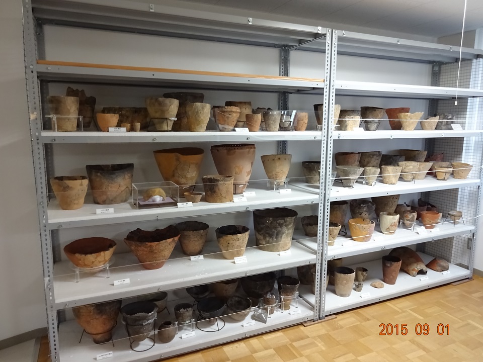 職員さんに展示室に案内していただいた。こんな感じに収蔵物がズラッと並べられている。