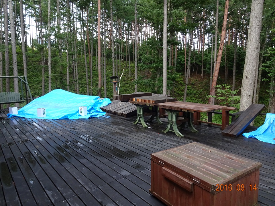 お昼過ぎになって晴れ間がのぞきはじめたので、午後1時頃から作業に着手。オフィスのウッドデッキも、メインウッドデッキと同じく「エボニー色のステイン剤」で塗装する事は決定済み。既にステイン剤も届いていたので、私と家内、三男の3人で一気に色塗りを始めた。