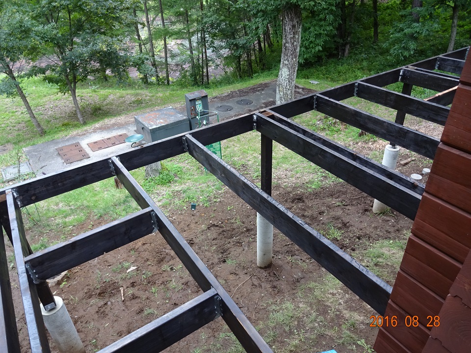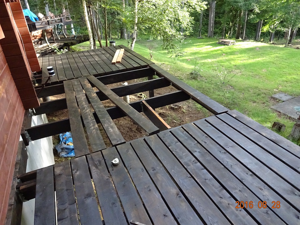 床材を敷設する前の構造材の状況。素人ながらも、WRC材注文の前に、私が簡単な「耐荷重計算」を行った。オフィスは片屋根で、ウッドデッキ側に雪がどさっと落ちる事はない。そこで、メインウッドデッキの構造材が2X10材であるのに対して、オフィスは2X8材で構成した。
