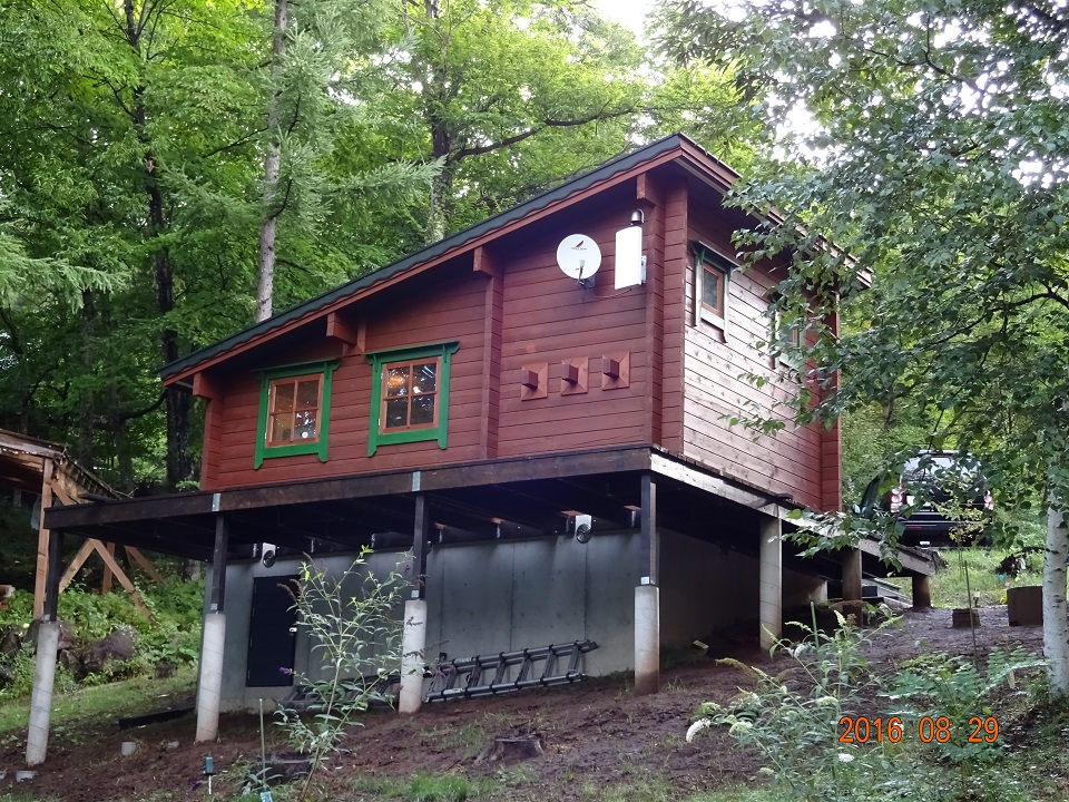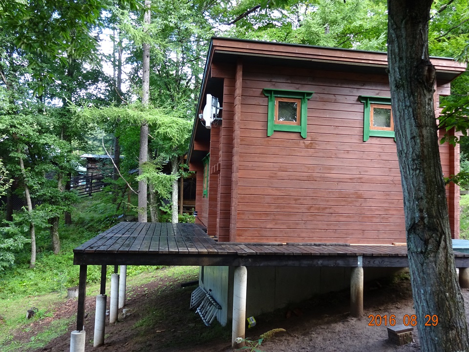29日朝に西側ウッドデッキの仕上がりを写真撮影。美しい出来映えだ!オフィスログ壁際の細かい作業は私が後日、施工する。「小細工の魔術師」の得意分野である!