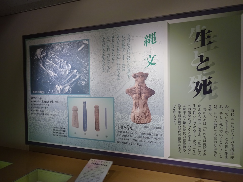 疑問解消後、常設展示室に入った。すぐに縄文展示コーナーを発見。「生と死」「縄文」と大きな文字を記したパネルに思わず見入ってしまった。