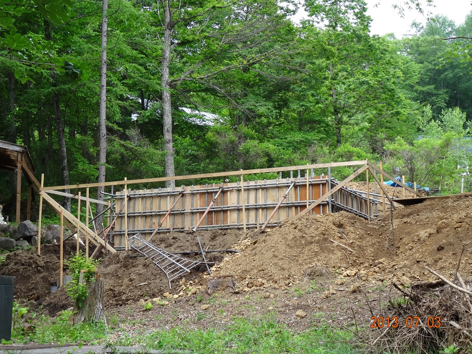 傾斜地下側から見た基礎の状況。基礎レベルはもう少し低いかと思っていたので、型枠部分が地面から、かなり突き出ているのは意外だった。