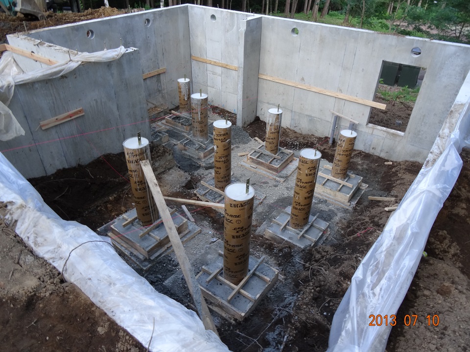 朝から独立基礎11本にボイド管を立ち上げて生コンの流し込み作業が進められた。速乾コンクリートを使うので、翌日にはボイド管を撤去できるとの事。この日については、その後、2016年夏のオフィスウッドデッキ増設工事 https://www.triglav.life/?page_id=17508 でもまったく同じ工程が再現されることになる。