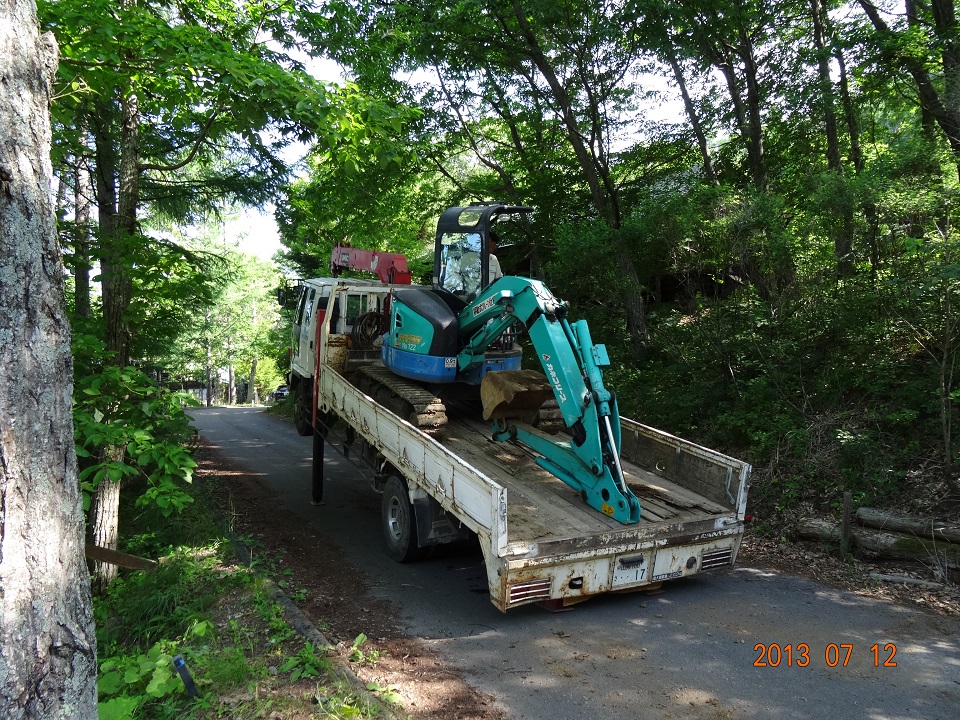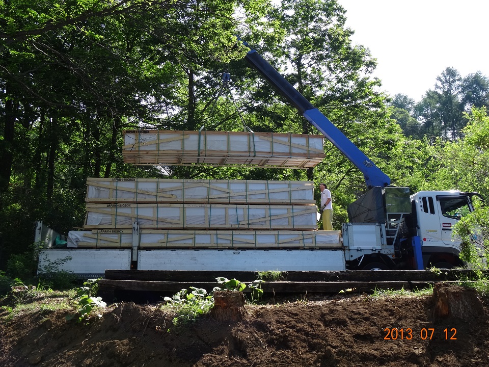 忘れもしない2013年7月12日午前8時7分、八ヶ岳本宅の枕木駐車場前にログキットを満載した大型Unic車が到着した。