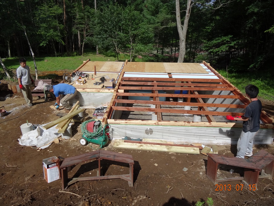 2013年7月15日 海の日。この日も快晴で午前8時過ぎから作業開始。根太を固定し、昨日の内にカットしておいたスタイロエースのはめ込み作業を進める。その上に、構造用合板を敷いて、これから積み上げて行くログ壁の足場を確保するのだ。