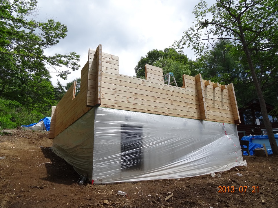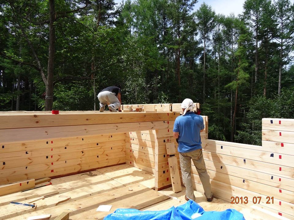 2013年7月21日 日曜日。この日も、棟梁Tさんと次男Cを助っ人にログ壁立ち上げ作業が続く。