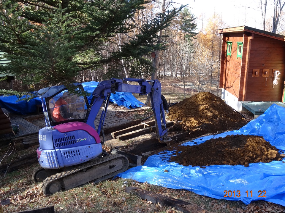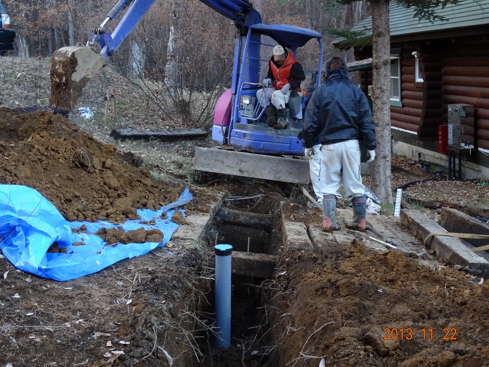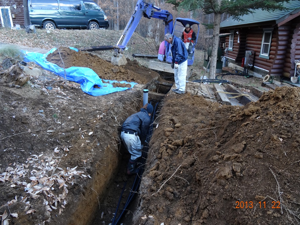 11月3日のウッドデッキ工事完成から2週間程経過した頃に、水道業者さんから、11月22日に上水道配管工事を行う旨の待望の連絡があった。地面が凍結した後は、配管作業に手間取るとの事で、多忙な中、かなり無理にスケジュールを組んでくれたようだ(改めて感謝)。