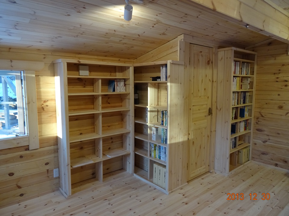 自宅から運び入れた蔵書をそのまま放置するわけには行かない。八ヶ岳滞在時には、私単独で「書棚作成」に取り組んだ。天井や床材、トイレ壁材、窓枠飾り等の残材を有効活用して作成する事に最大のポイントがあった。最初からそのように計画して、部材カットの際に可能な限り無駄を排除してきたのである。こんな私を家内(社主)は『小細工の魔術師』と呼ぶ。