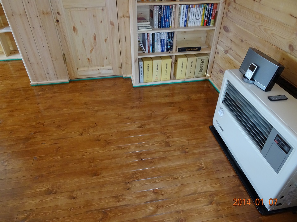 大晦日と正月三箇日を川崎自宅でノンビリと過ごした私は、2014年1月4日の朝、八ヶ岳に初出勤した。8日の朝に川崎自宅に戻らねばならなかったので、作業可能なのは7日までだ。この間、12月30日の完工宣言時点では未了になっていた、床材塗装、ロフト1Fの書棚作成、テレビ台組立、そして、本当の意味でオフィス・セルフビルド作業の締め括りとなる「ロフト用階段の固定作業」を終える計画であった。