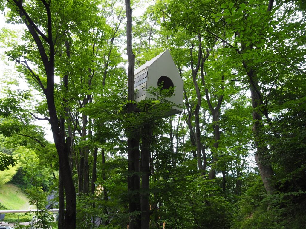 次なる鑑賞対象となったツリーハウスの名称は『bird-apartment』、野鳥さんのアパートである。 駐車場側から見ると『間』の左手やや手前に位置する。デザイナーは「オフィス nendo(代表:佐藤オオキ氏)」さんだ。 …